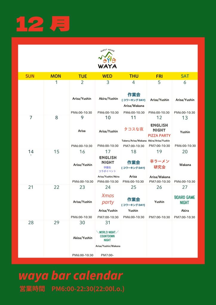 waya bar12月営業日のお知らせ